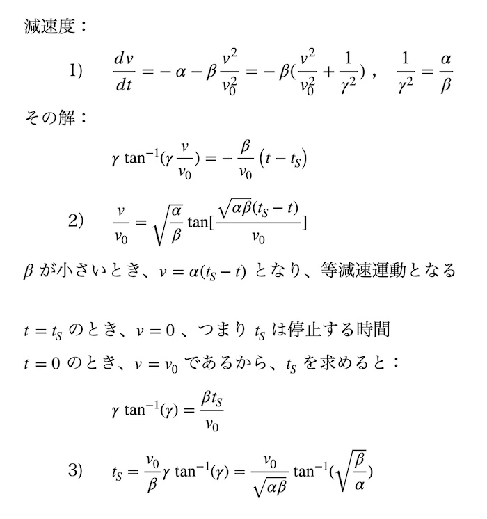 回生ブレーキによる減速度を α(0.14G一定)、空力ブレーキによる最大減速度を β(0.06G)とする。空力ブレーキの効きは、速度の2乗に比例するので、減速運動は式(1)となる、ここで v0 = 500km/h。