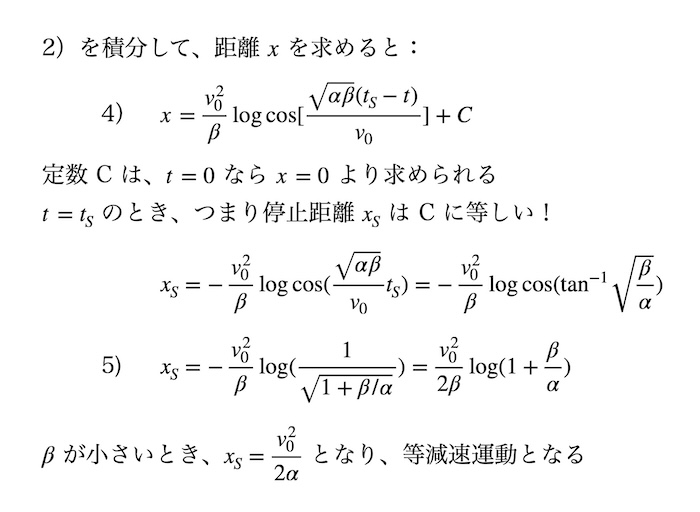 距離 x も容易に求められ、停止距離 xS は式(5)となる。